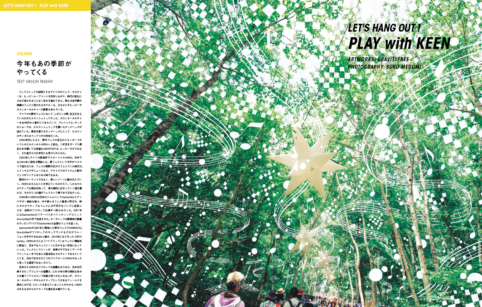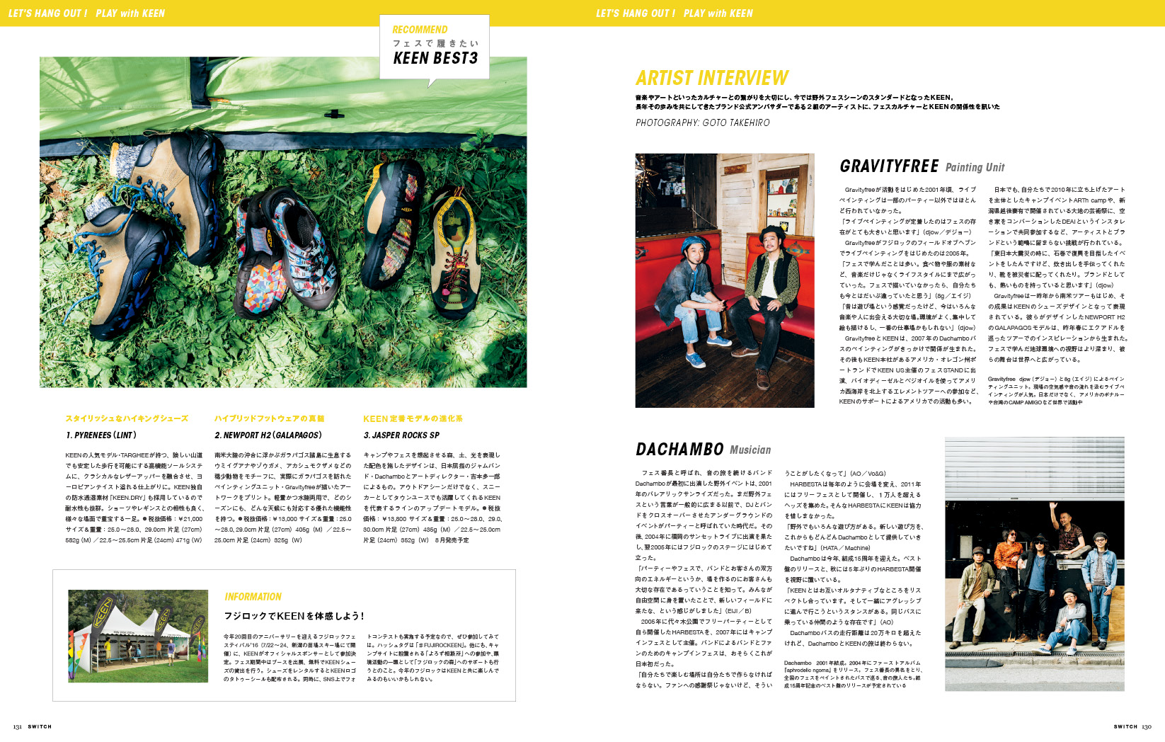 SWITCH最新号(Vol.34 No.7)では、長年、アメリカのフェスカルチャーを牽引してきたKEENの歩みを紐解く記事をはじめ、ブランドの公式アンバサダーを務めるペインティングユニット・Gravityfreeと、ジャムバンド・Dachamboという2組のアーティストへのインタビュー、フェスで履きたいKEENのシューズ紹介なども掲載しています。その記事のPDFを期間限定(6月20日~9月20日)で無料配布いたします。
